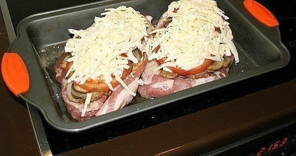 Взять 2 куска свинины,- шеи, толщиной около 2 см. Положить на противень, посолить, поперчить.