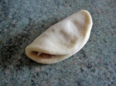 6. На кругляшке распределить равномерно 1 ч. л. фарша (полную), щепотку сыра. Сложить её пополам. Затем ещё раз пополам. Кончики слегка снизу прищипнуть.
