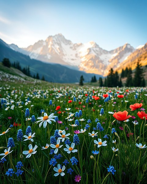 Ultra-detailed, breathtakingly beautiful photo of alpine meadows in summer, covered in vibrant wildflowers (edelweiss, bluebells, poppies). Majestic snow-capped mountain peaks under a crystal-clear blue sky with soft, golden sunlight. Lush green grass, delicate dew drops on petals, and a gentle breeze blurring some flowers.