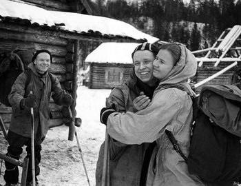 Перевал Дятлова: Игорь Дятлов (слева) наблюдает, как Юрий Юдин (в центре) прощается с Людмилой Дубин...