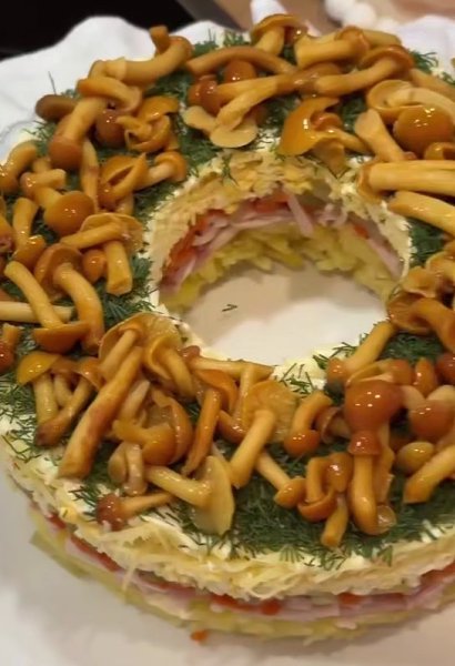 Праздничный слоёный салат с опятами